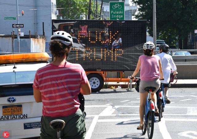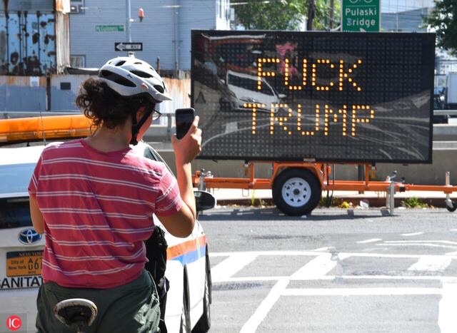 Date of Picture: 2018-08-23FUCK TRUMP sign in Brooklyn.2018, someone hacked into a electronic street sign at the intersection of McGuinness boulevard and Eagle street in Greenpoint Brooklyn and put FUCK TRUMP on the board.