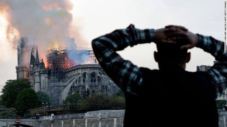 The fire rapidly spread and took over the iconic cathedral as onlookers scrambled to get a view of the destruction, even as soot and cinder fell onto them. Firefighters atop cherry picker cranes sprayed water onto the church in an attempt to calm the flames.
