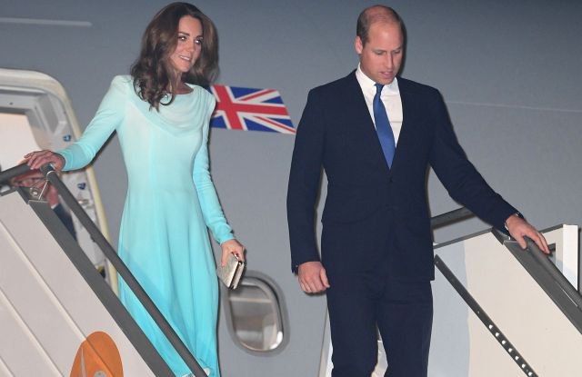 The Duchess stepped down from their RAF Voyager plane in a blue Catherine Walker dress as she was met by Shah Mahmoud Qureshi, Pakistan’s foreign minister.