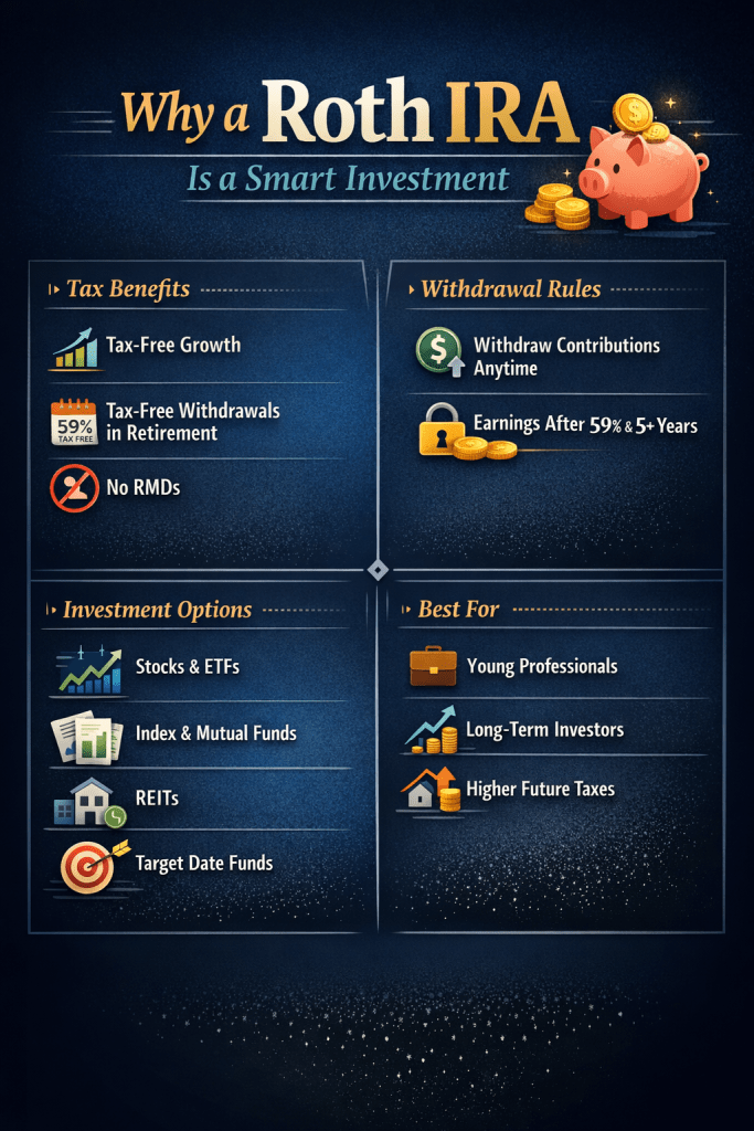 Investment options are broad, including stocks, ETFs, index funds, mutual funds, REITs, and target-date funds, making it ideal for both passive and active investors. For long-term planning and tax efficiency, a Roth IRA is a smart cornerstone of any portfolio.